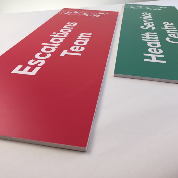 You need indoor signs that will simply indicate to staff and managers where each team is located... I would in this case use simple cost-effective vinyl printed signs, backed by foam board, so that its sturdy.